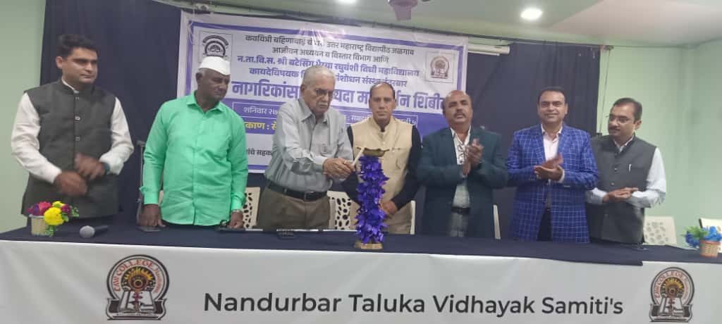 नंदुरबार (प्रतिनिधी) प्रधानमंत्री उच्चतर शिक्षण अभियान अंतर्गत कवयित्री बहिणाबाई चौधरी उत्तर महाराष्ट्र विद्यापीठाचा आजीवन अध्ययन व विस्तार विभाग आणि नंदुरबार तालुका विधायक समिती यांच्या सहकार्याने बटेसिंगभैया रघुवंशी विधी महाविद्यालयात ज्येष्ठ नागरिकांसाठी कायदेविषयक जागृती शिबिराचे आयोजन करण्यात आले. हे शिबिर कायदेविषयक शिक्षण व संशोधन संस्था, नंदुरबार येथे दिनांक २६ सप्टेंबर रोजी पार पडले.